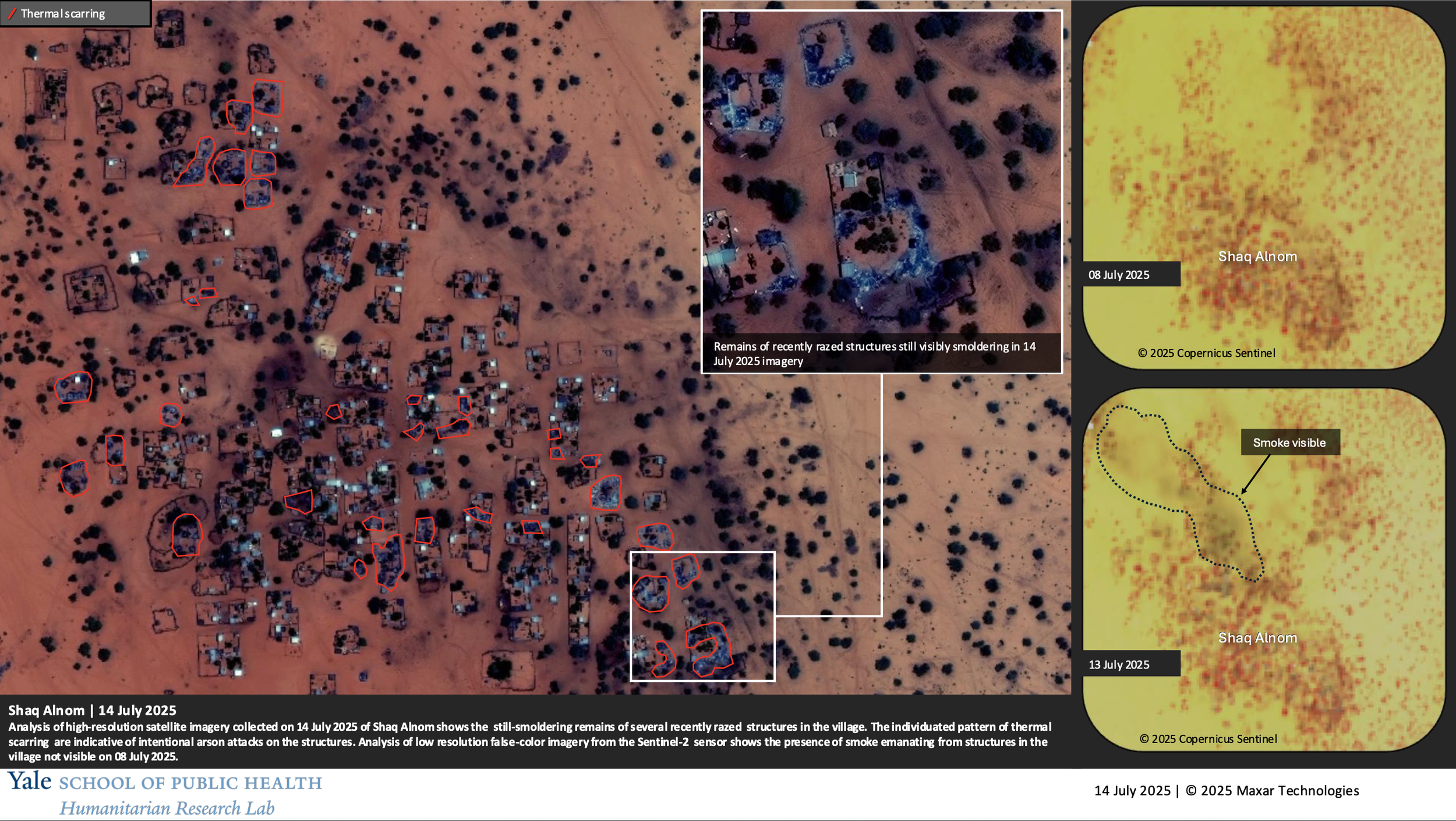 Analysis of satellite imagery by Yale’s Humanitarian Research Lab (HRL) has further documented the destruction of Shak Al-Noum. The images show widespread thermal scarring, smoldering ruins, and burned structures consistent with deliberate arson. HRL also documented RSF vehicles in nearby areas, as well as newly displaced persons and expanded human burial mounds in the nearby state capital of El-Obeid.